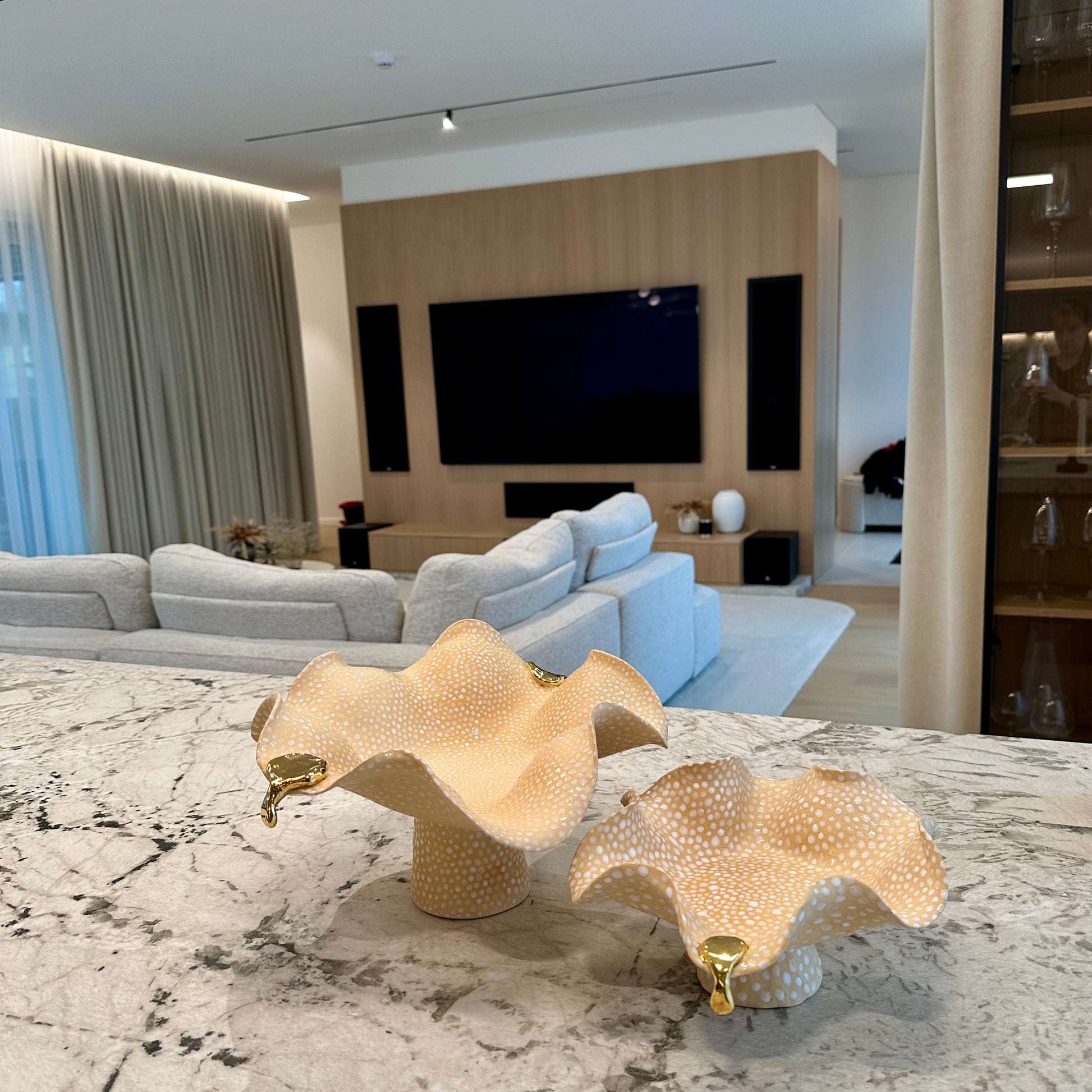 Šis rankų darbo namų dekaravimo indas - išskirtinis meno ir dizaino kūrinys, kuriame dera subtilumas, prabanga ir organiškas judesys.