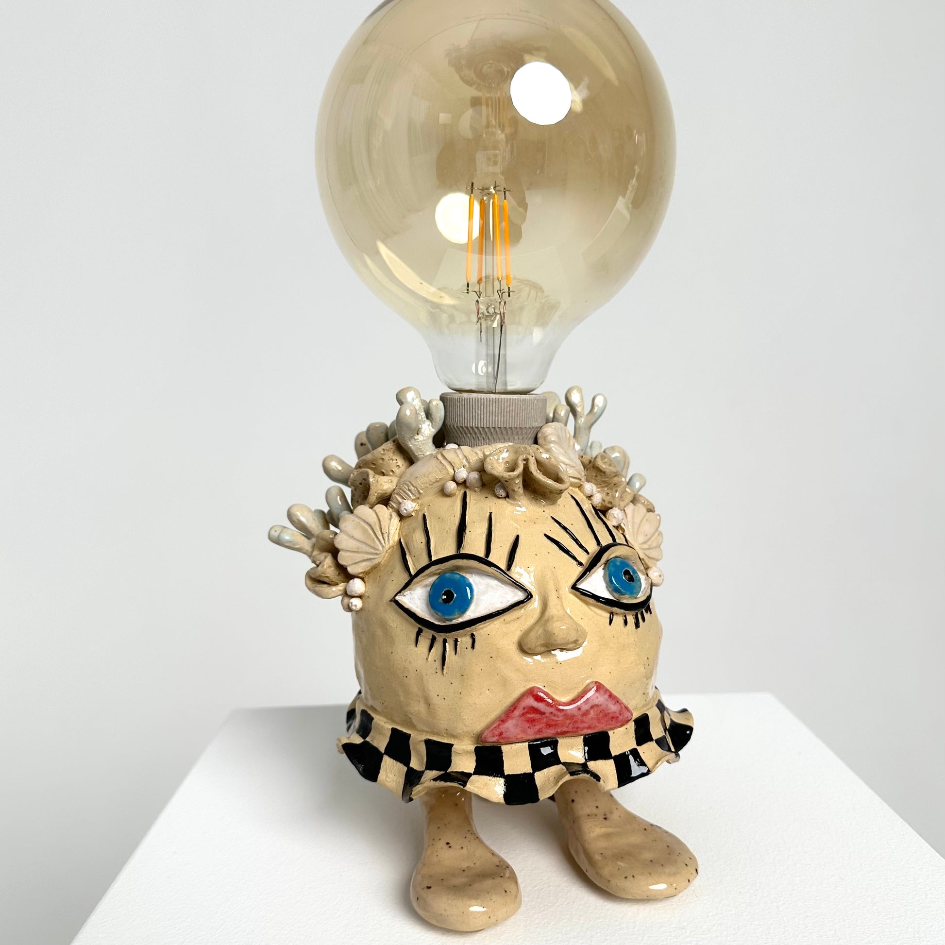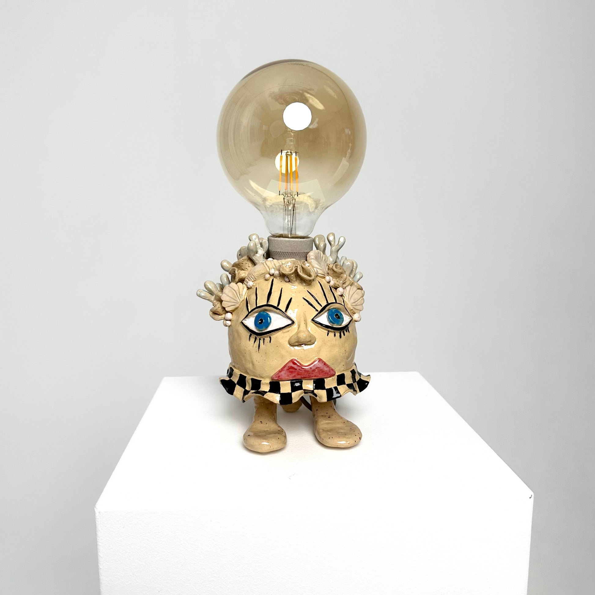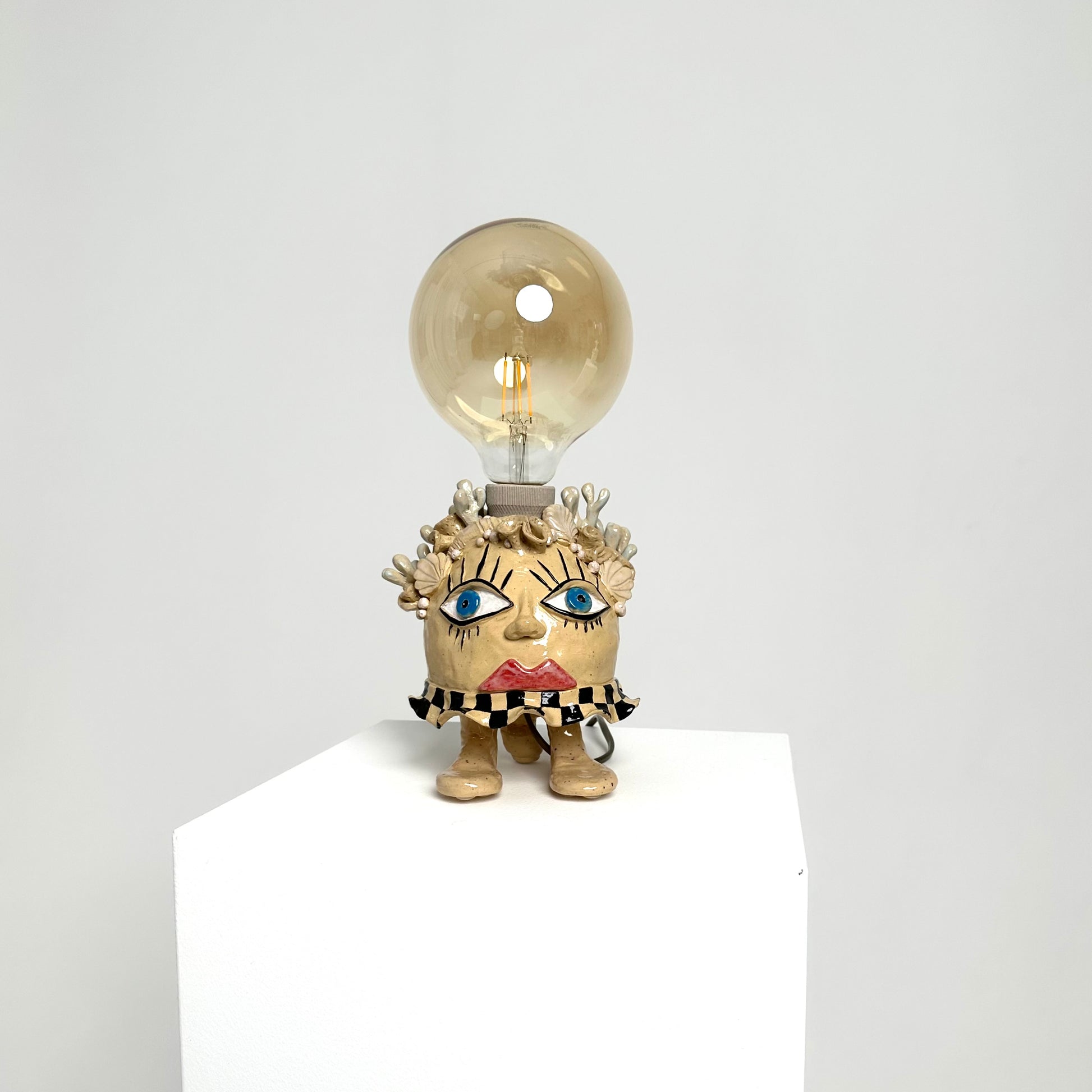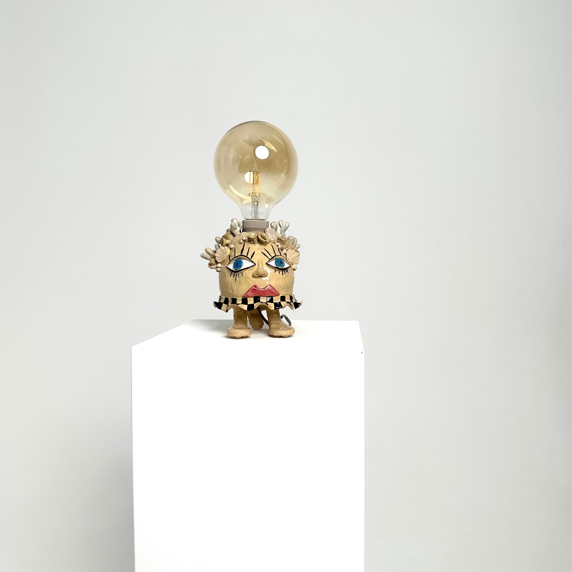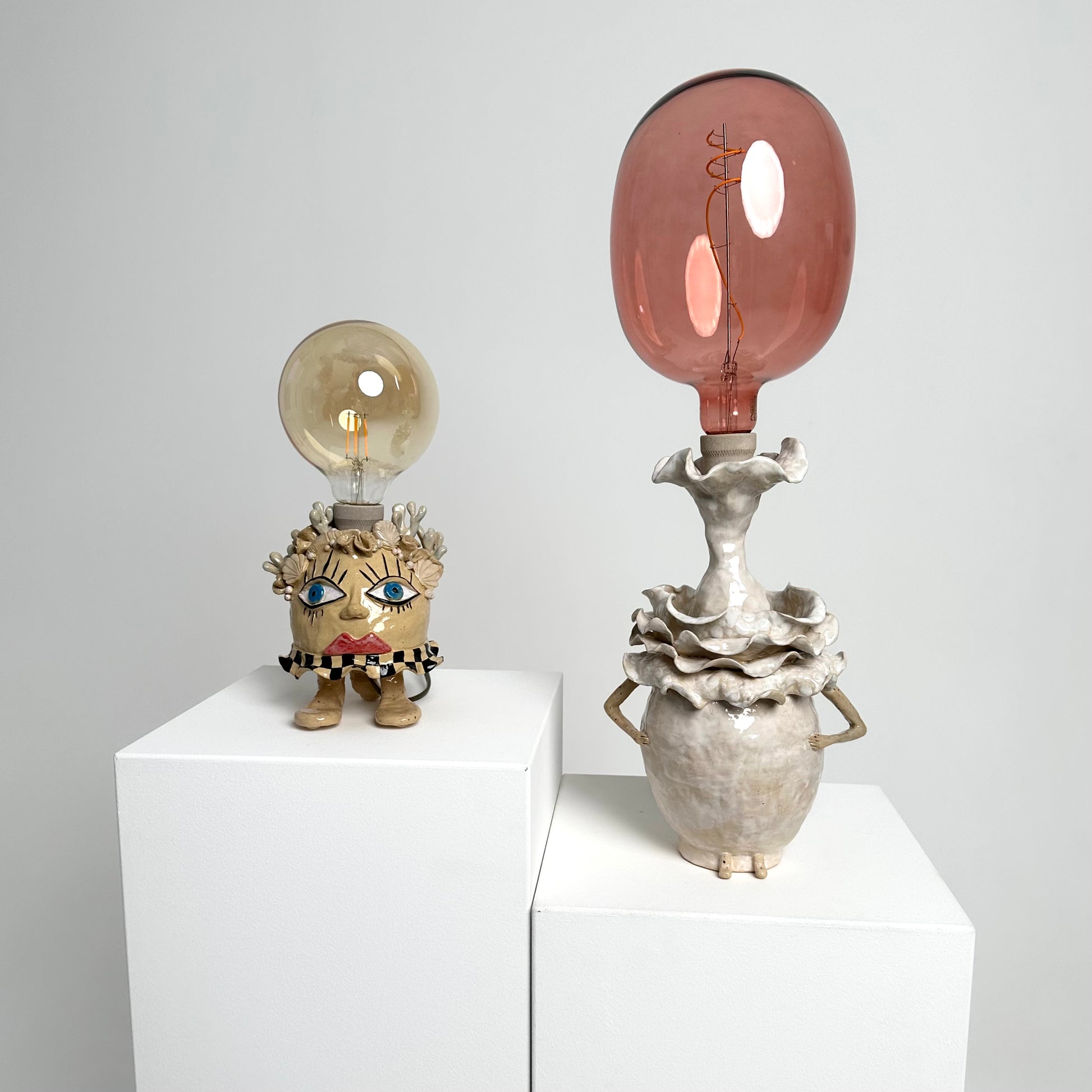 Rankų darbo keraminiai šviestuvas, turintis stiprią skulptūrinę estetiką.